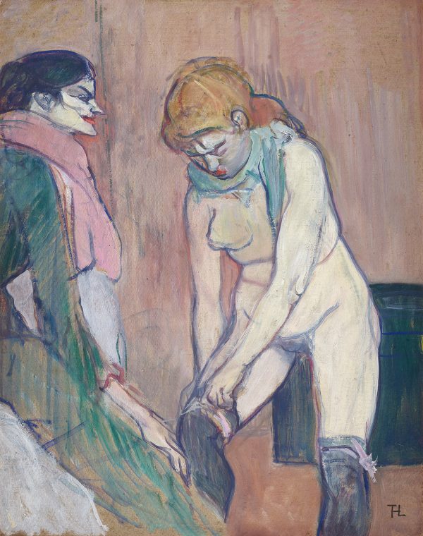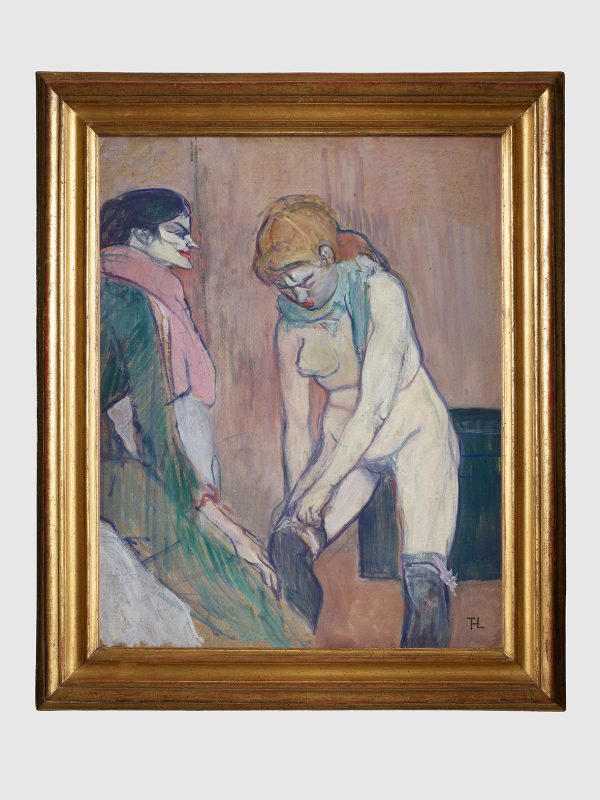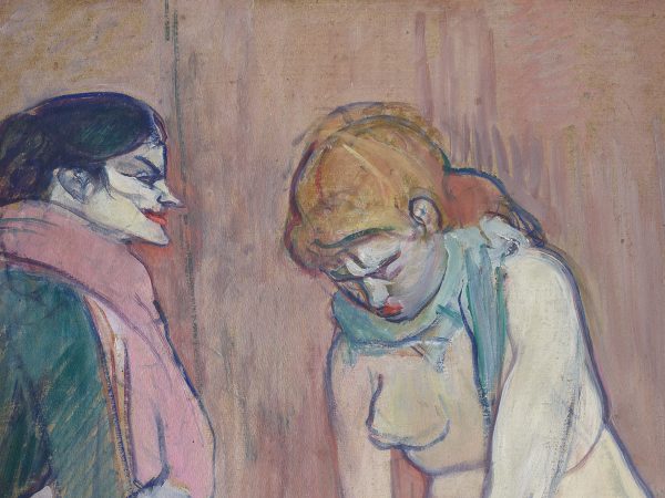 Réalisée vers 1894, cette huile sur carton appartient à la série que Toulouse-Lautrec consacre aux maisons closes parisiennes. L’artiste, qui fréquente ces lieux et en observe les scènes du quotidien, y développe une approche profondément moderne : il peint sans jugement moral, sans idéalisation ni voyeurisme, des femmes saisies dans l’intimité de leur existence.
