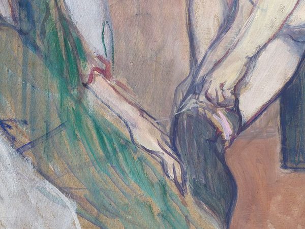 Par son traitement pictural, l’œuvre affirme toute la singularité du style de Lautrec. Le trait, vif et synthétique, proche du croquis, cerne les formes avec une grande liberté. Les aplats colorés, hérités de son activité d’affichiste, simplifient les volumes et accentuent la présence de la figure. Le carton laissé apparent participe à cette esthétique de l’instantané, tandis que quelques rehauts suffisent à suggérer la lumière et le modelé du corps.