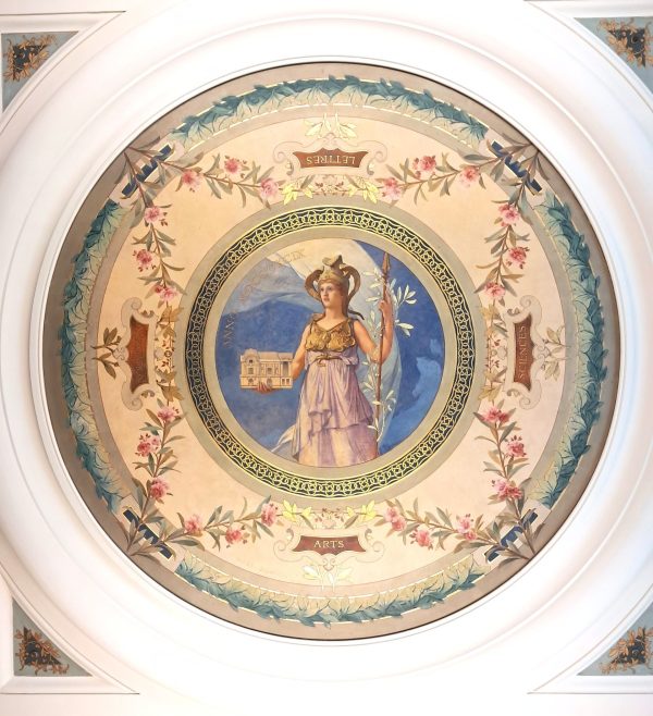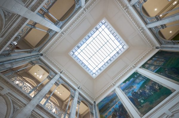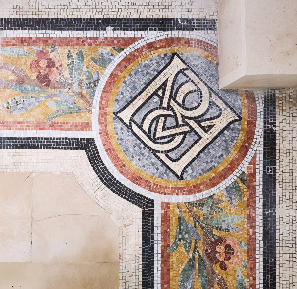 Réalisée par la maison Facchina, célèbre pour ses réalisations prestigieuses comme le Petit Palais ou l’Opéra Garnier. Cachée depuis des travaux dans les années 1970, elle a été redécouverte à l’occasion des travaux et patiemment restaurée. Les monogrammes MBB de Musée Bonnat Bayonne ont été reconstitués, donnant une vision d’ensemble de ce à quoi le patio devait ressembler à l’ouverture du musée.